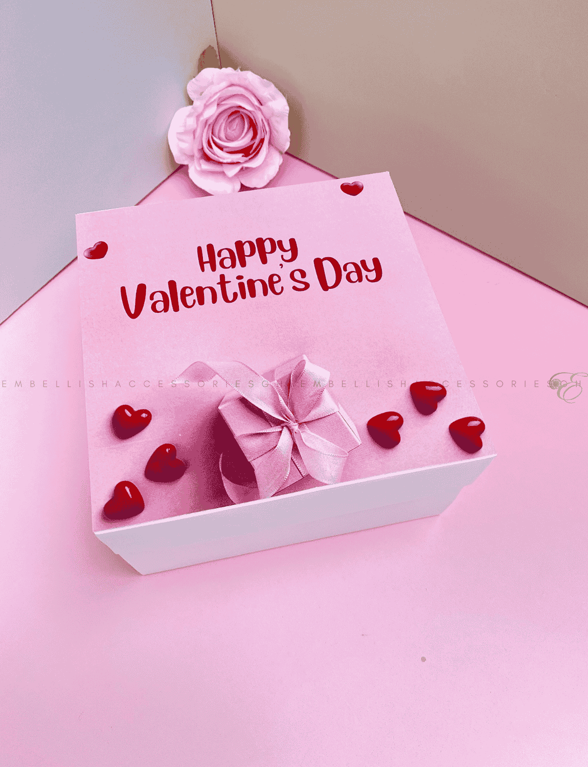 This stylish 7inch square Valentine box is perfect for packaging snacks, skin care products and other small gift items. Boxes are made with 350gm paper and should be handled with care to prevent damage. Dimensions: 7*7*4inches