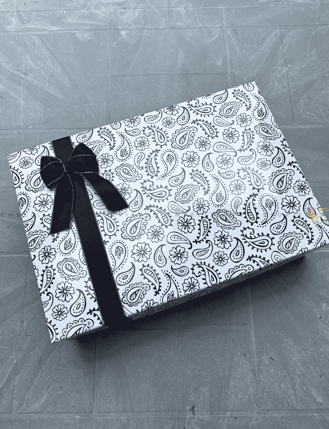 • Black gift box E with gold speckled ribbon