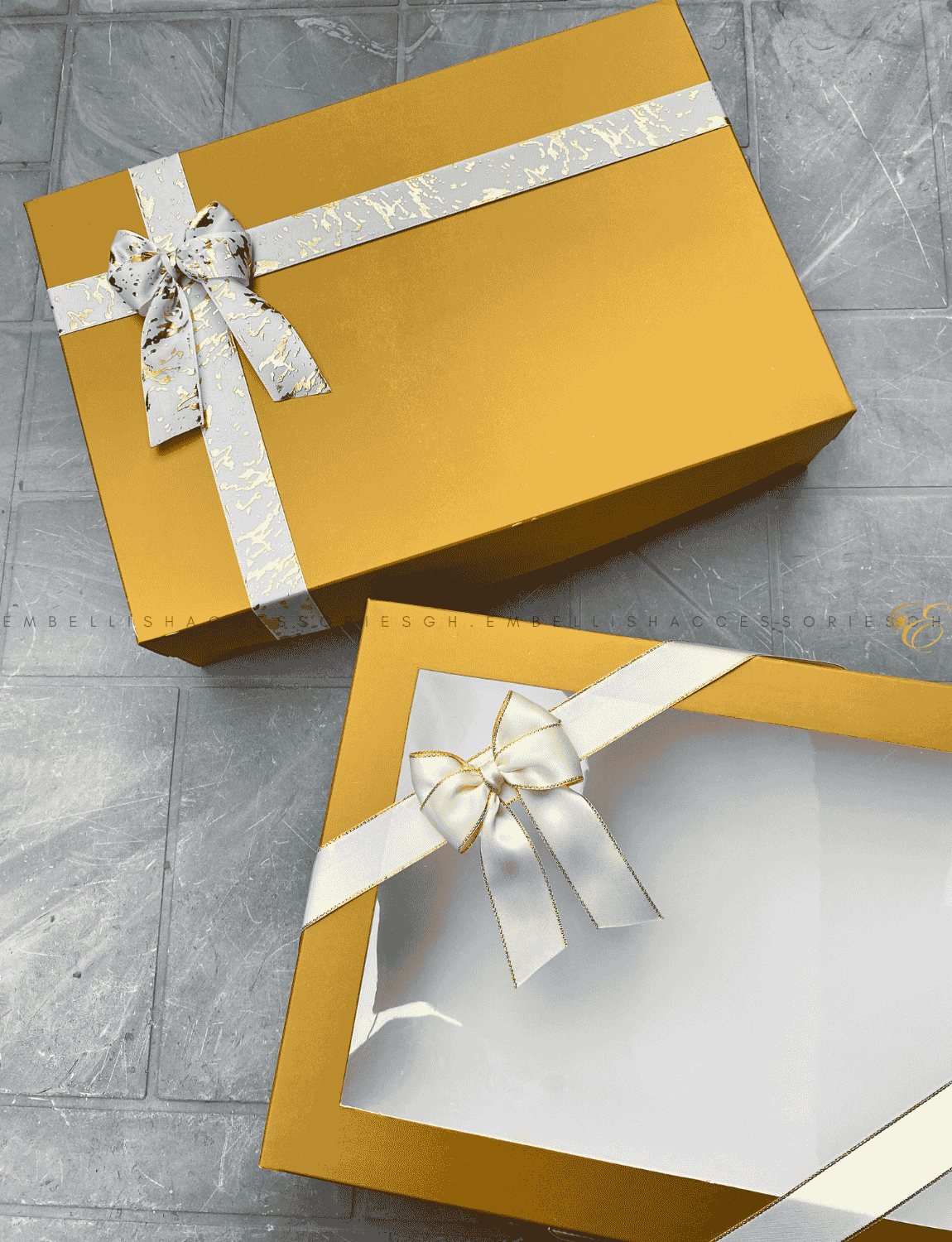This stylish Gold Gift Box E can be used for packaging 12yards African print fabric or just pastries etc. All boxes come decorated with a ribbon. Boxes are made with 350gm paper and should be handled with care to prevent damage. Dimensions: 13*9*2.75inches