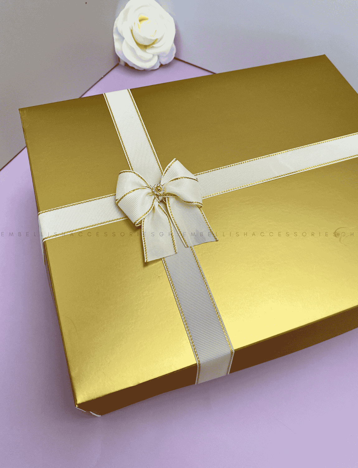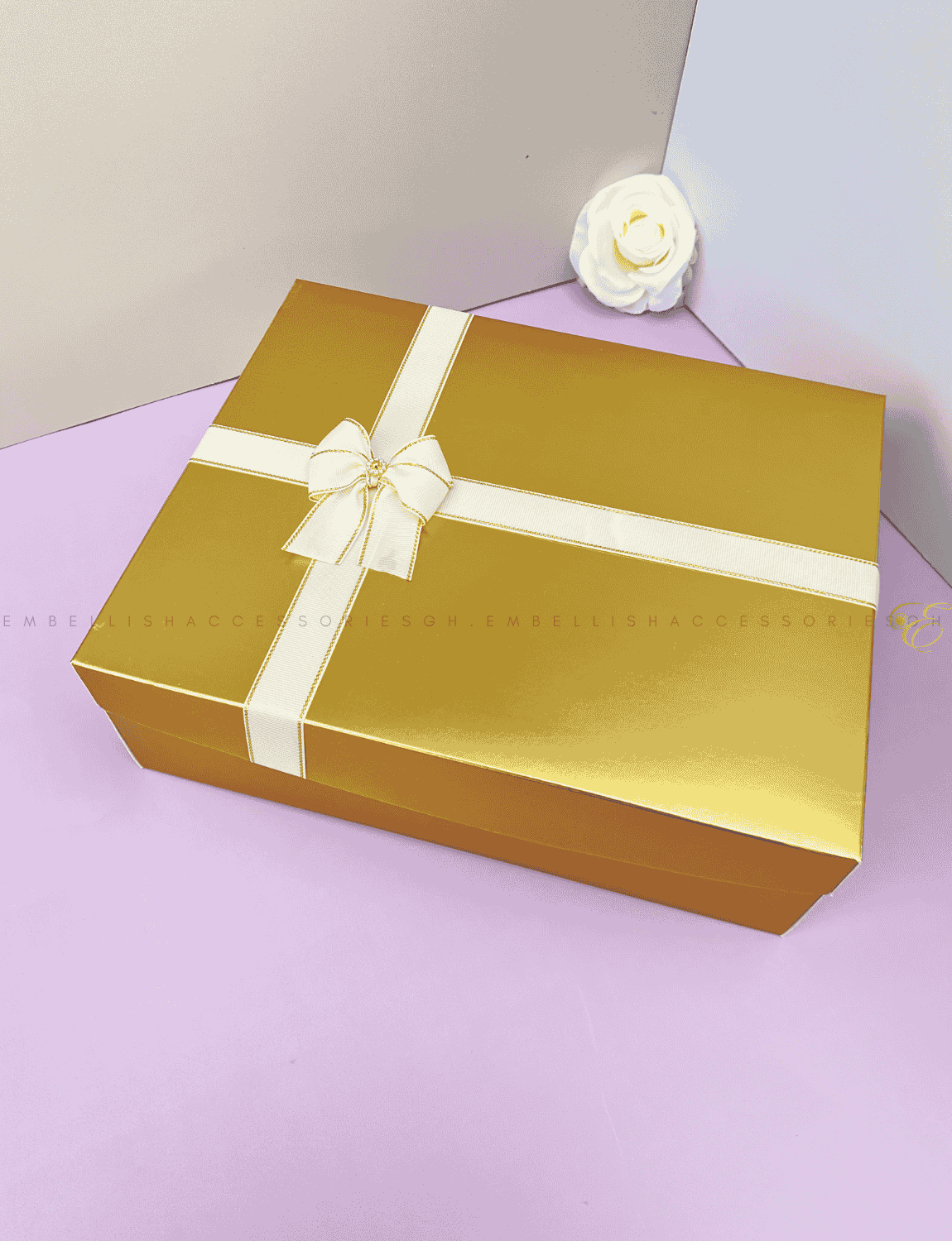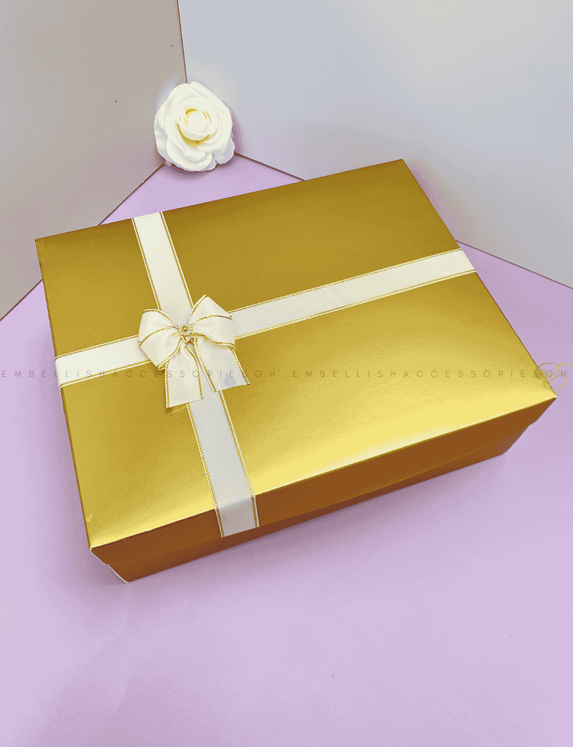 This gold Christmas box F is 12.5*10*4inches in dimension. Gold to represent royalty. Boxes are made with 350gm paper and should be handled with care to prevent damage.