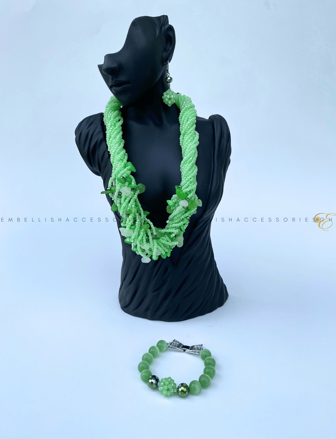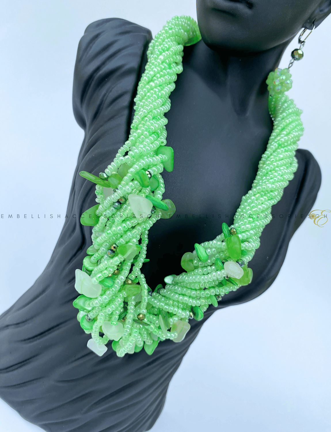 The green multi strand seed bead necklace is a beautiful combination of seed beads, chip beads and crystals. Necklace is approximately 20inches long and comes with a bracelet and pair of earrings. It is finished with a lobster clasp and has a 1inch extension chain attached.