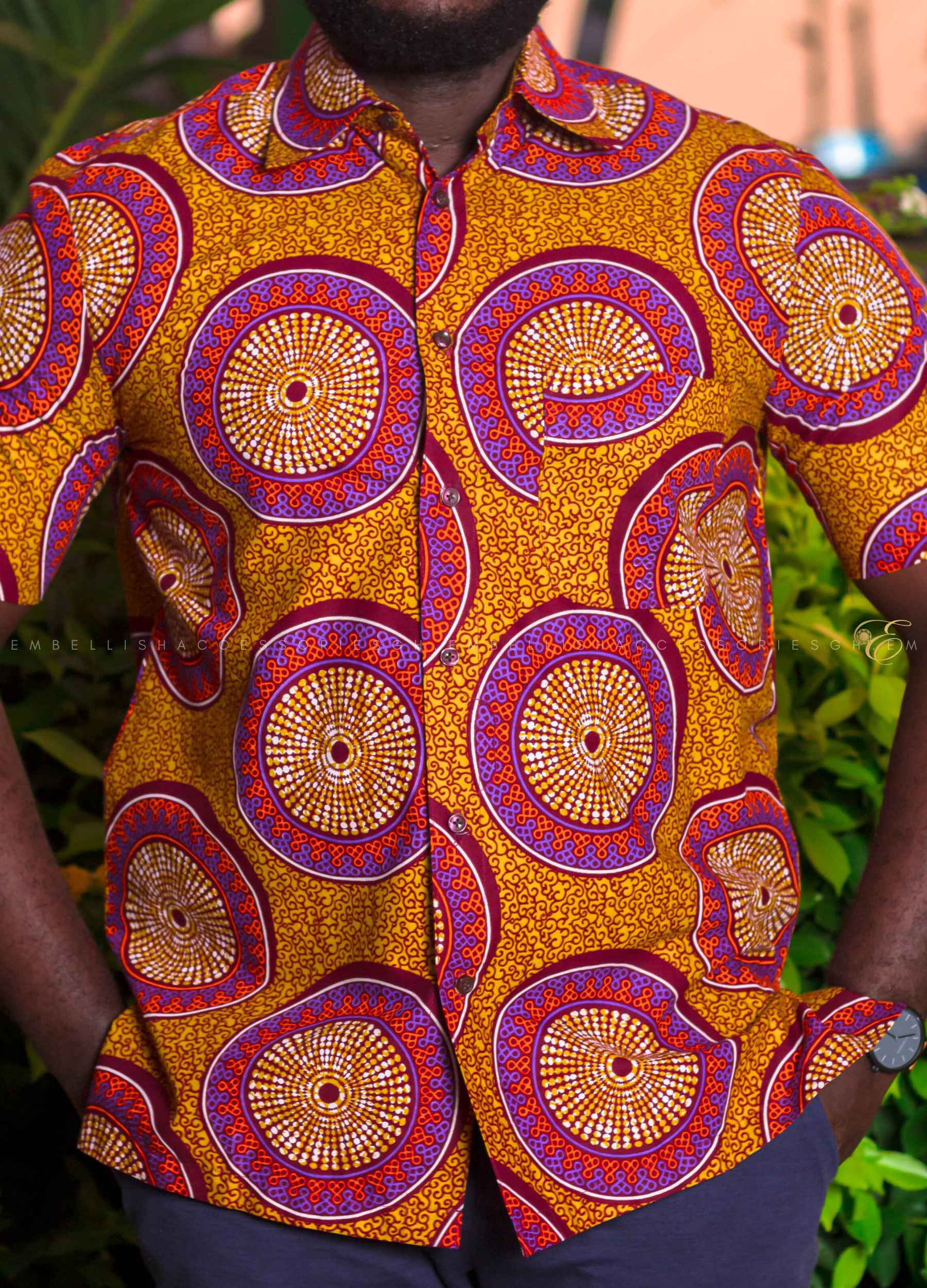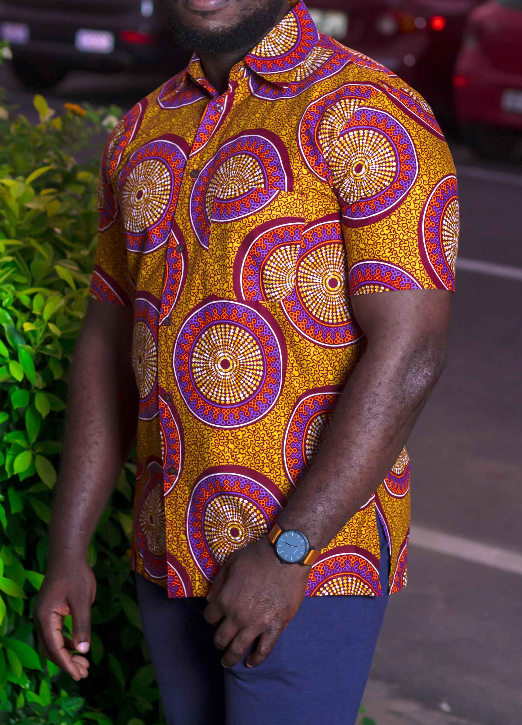 This patterned short sleeve shirt is proudly made in Ghana with authentic Ghanaian GTP nustyle fabric. To keep your shirts looking new for long, do not bleach or wash with harsh detergents.