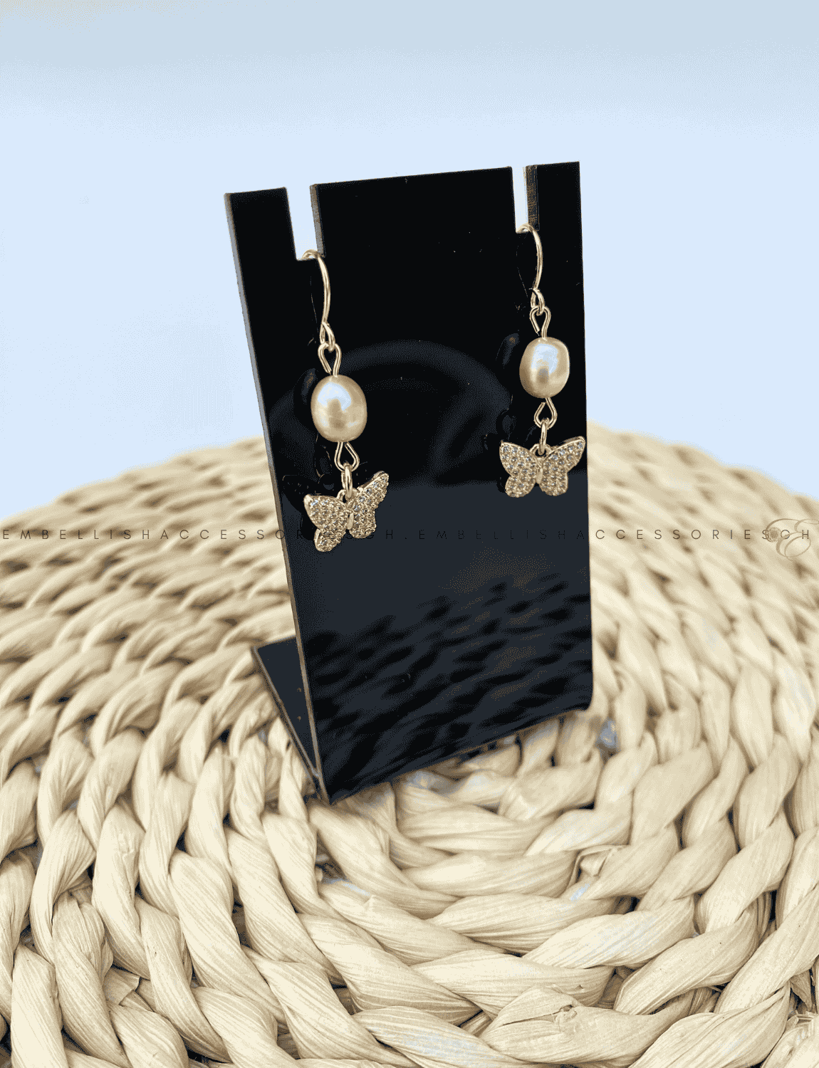 Embrace timeless beauty with our pearl butterfly earrings – where classic elegance meets whimsical design. These delicate earrings feature a lustrous pearl and a charming butterfly accent at the end creating a graceful feminine look. Lightweight and eye-catching, these earrings are perfect for bridal wear, date nights or everyday luxury.