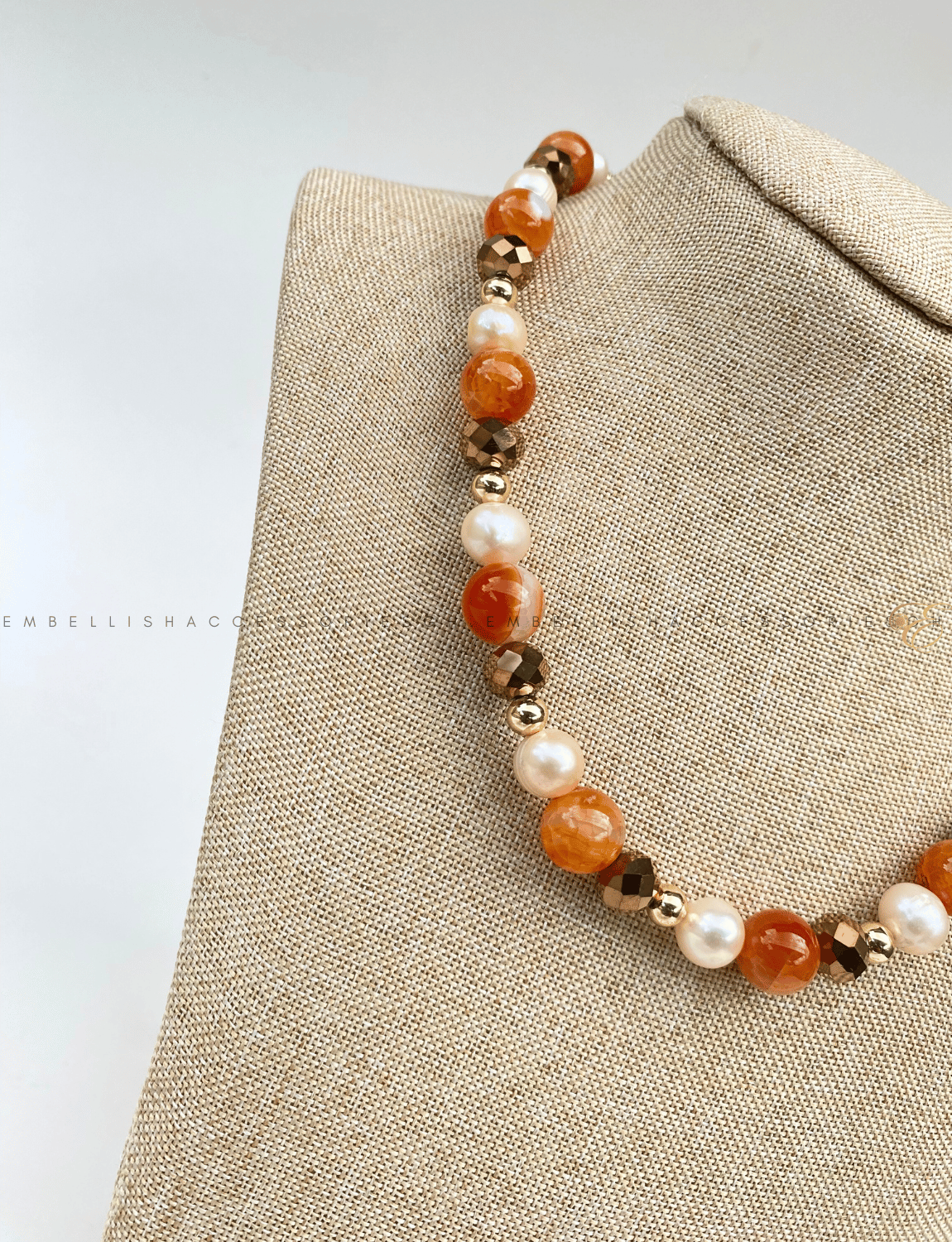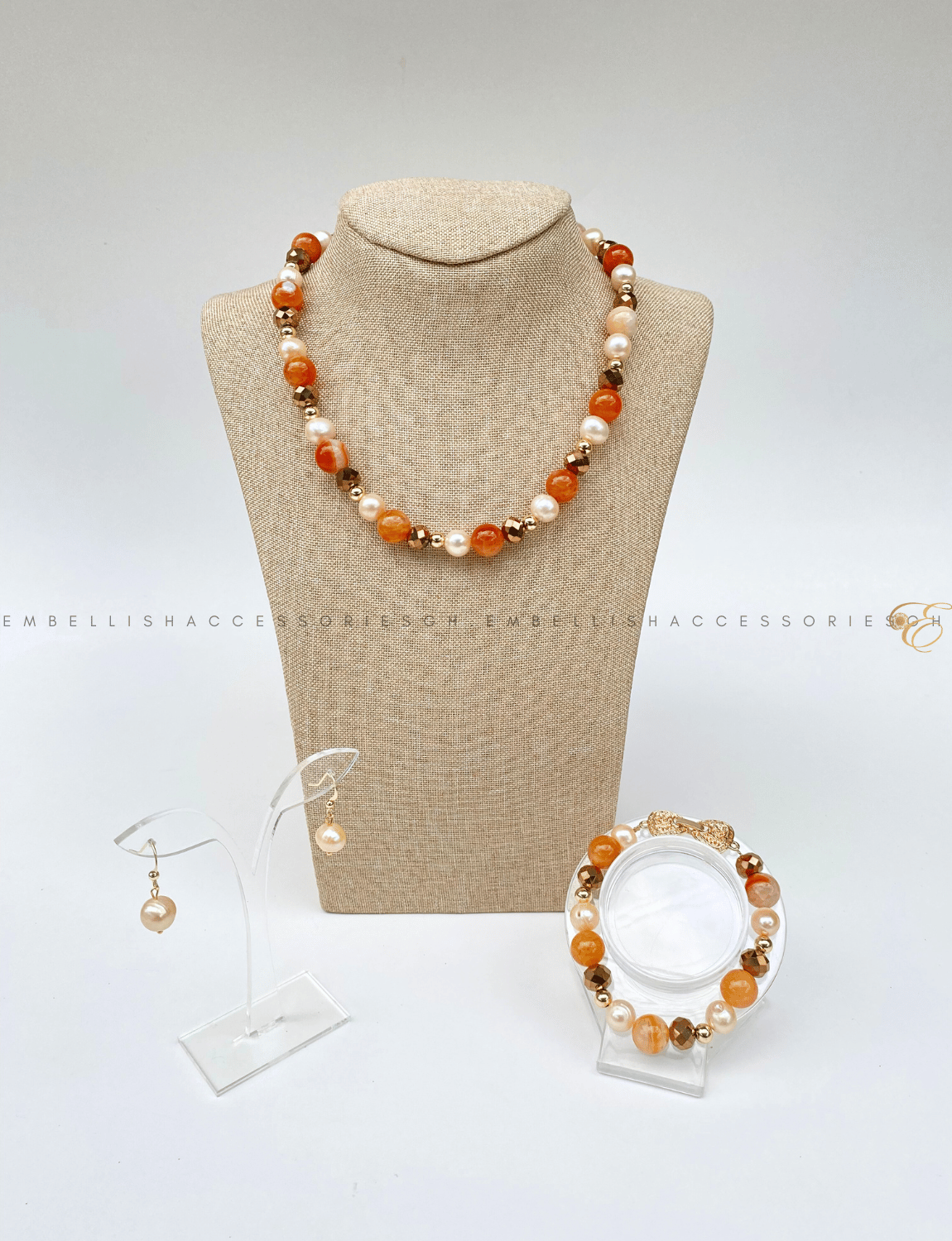 The pearl cocktail beads necklace like the name suggests, is a cocktail of beads; water pearls, agate beads and rondelle crystals crafted into this exquisite and timeless necklace set. Necklace is 18inches long and finished with a fold over clasp.