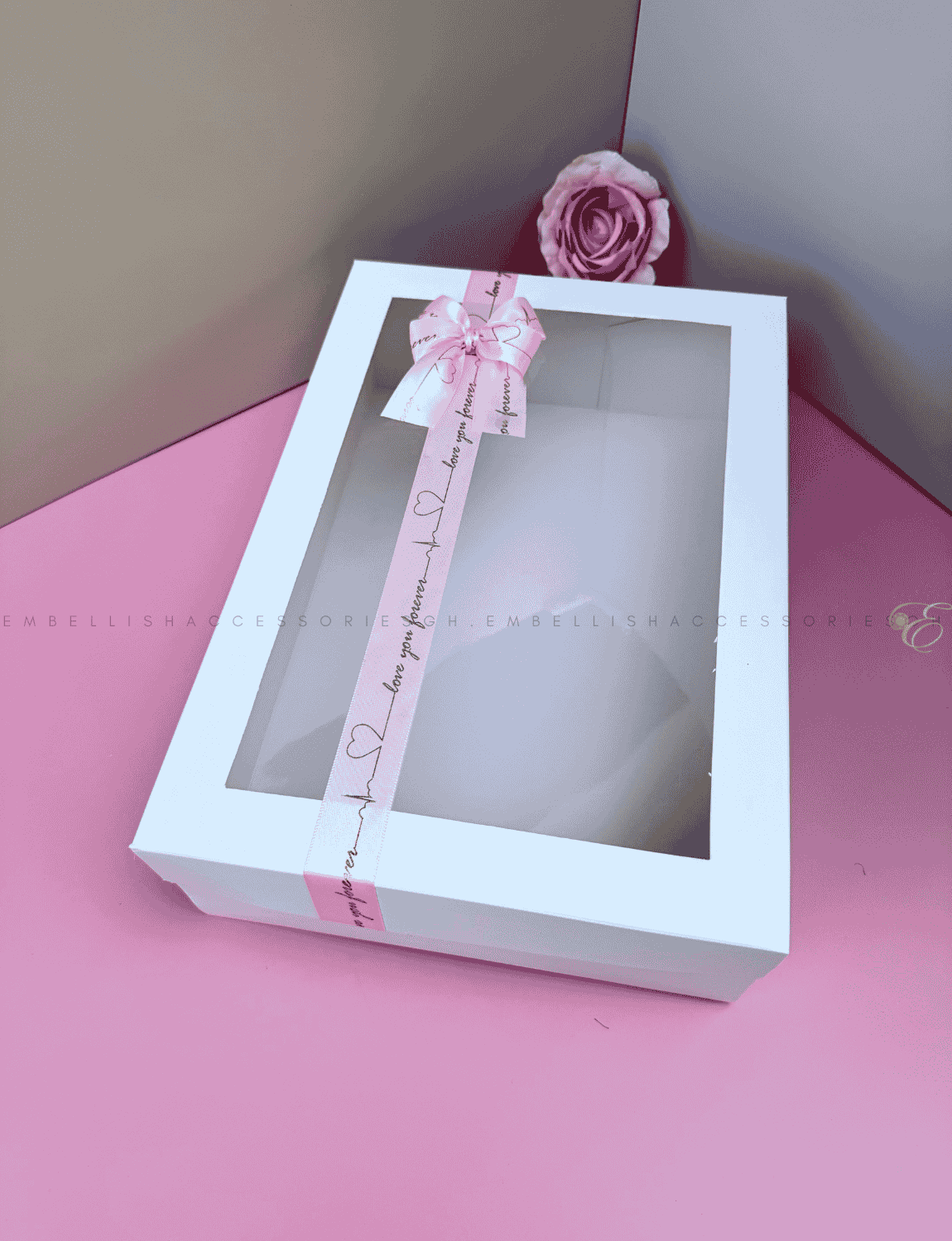 This pretty Valentine box e can be used for packaging 12yards African print fabric or just pastries etc. All boxes come decorated with a ribbon. Boxes are made with 350gm paper and should be handled with care to prevent damage. Dimensions: 13*9*3.5inches